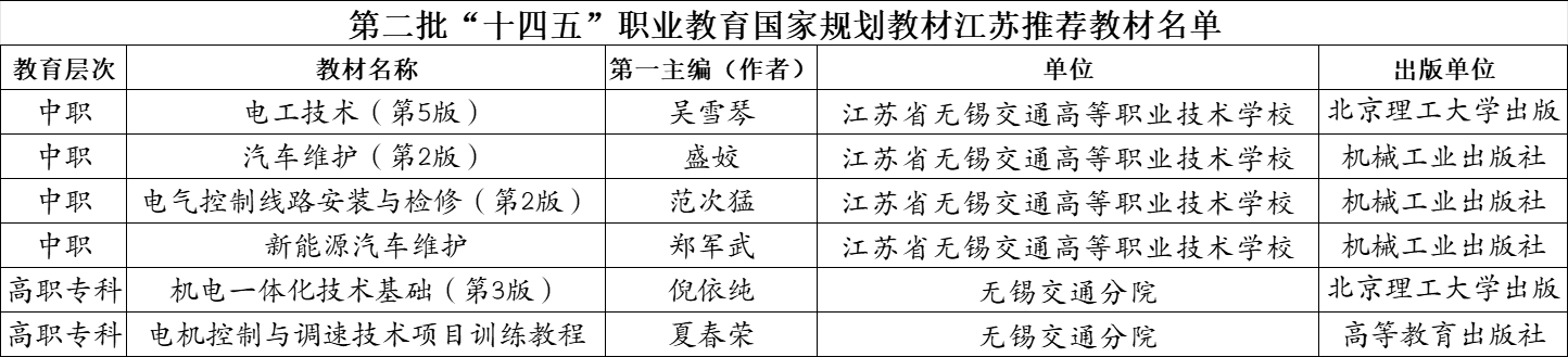 7月23日,江苏省教育厅公布的《省教育厅关于公布江苏省“十四五” 第二批职业教育规划教材名单的通知》中,我校《电机控制与调速技术项目训练教程》等3部教材成功入选。同时我校有6本教材获推送教育部参加第二批“十四五”职业教育国家规划教材评选。