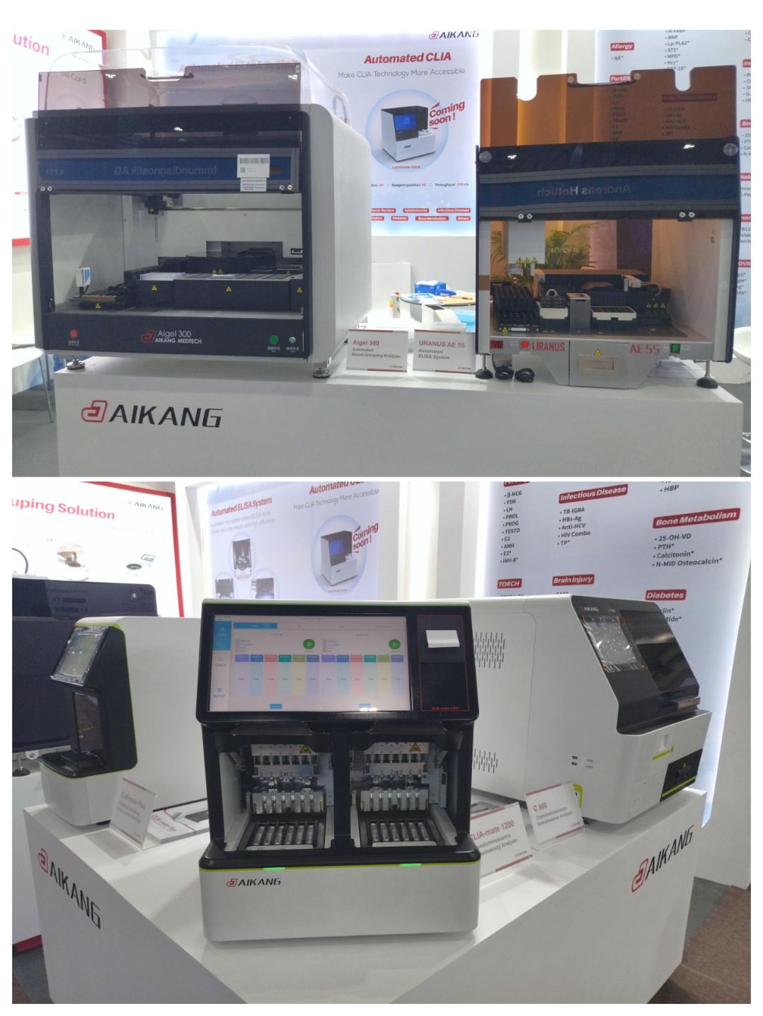 This time, Aikang showcased the Chemiluminescence Immunoassay solution (CLIA-mate Plus, C 900, CLIA-mate 1200), Automatic ELISA solution (URANUS AE55) and Automatic Blood Grouping solution (Aigel 300), which received much attention from a lot of new and old friends.