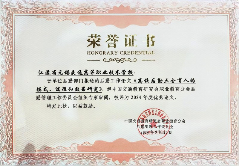 近日,由中国交通教育研究会职业教育分会后勤管理工作委员会组织的年度优秀论文评选活动落下帷幕。经过严格审阅和专家评审,学校后勤管理处投稿的论文《高校后勤三全育人的模式、途径和效果研究》脱颖而出,荣获2024年度优秀论文称号。