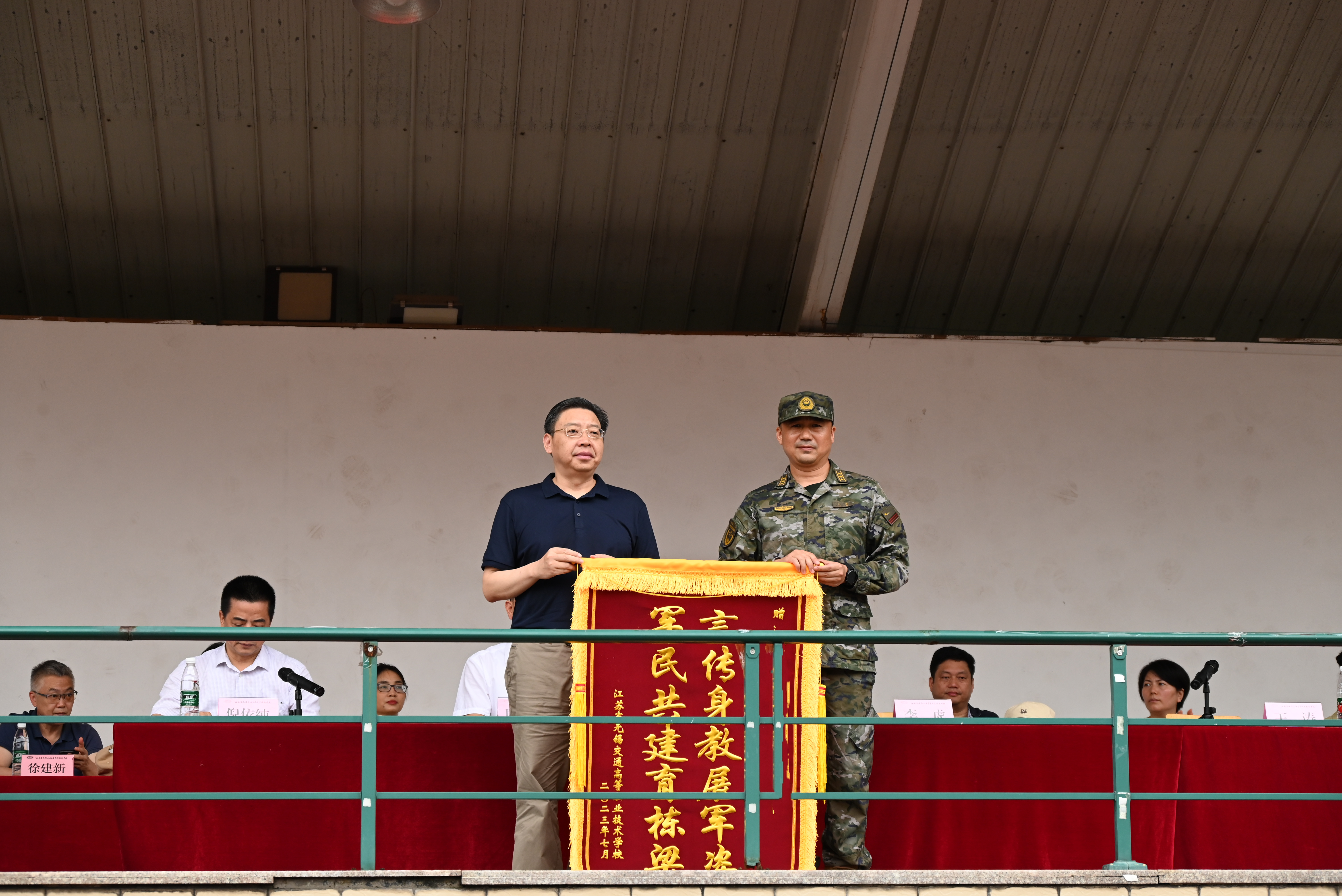 汇报表演结束后,李虎代表学校向承训部队赠送锦旗。