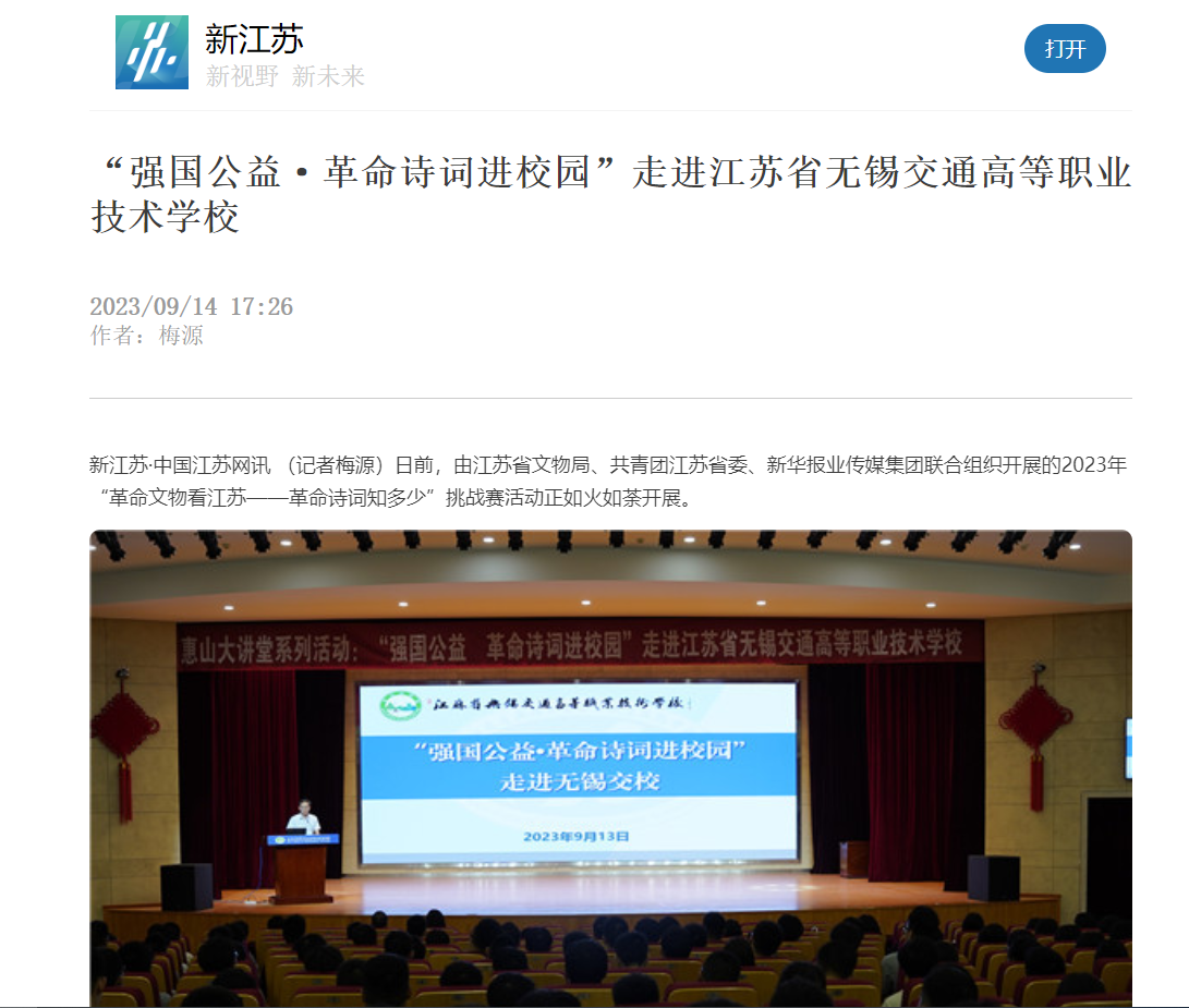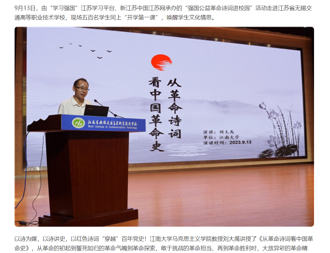 学习强国江苏学习平台:“强国公益·革命诗词进校园”走进江苏省无锡交通职业技术学校
