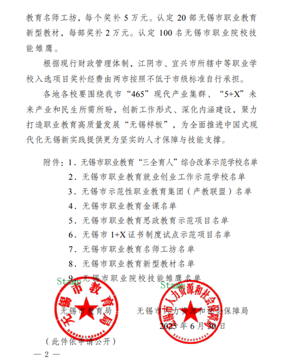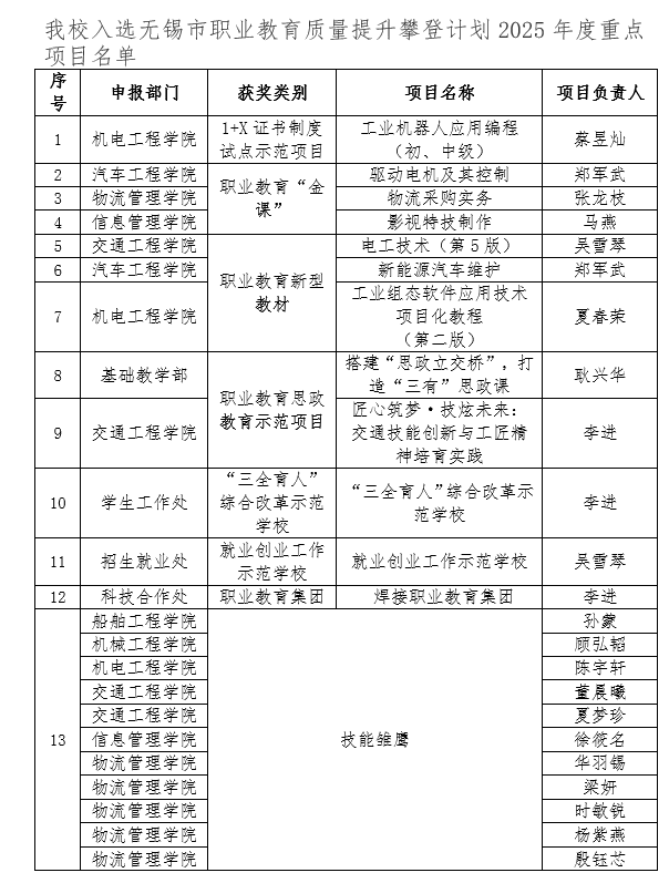 近日,无锡市教育局公布了无锡市职业教育质量提升攀登计划2025年度重点项目,我校12个项目入选、夏梦珍等11名同学被认定为“技能雏鹰”。