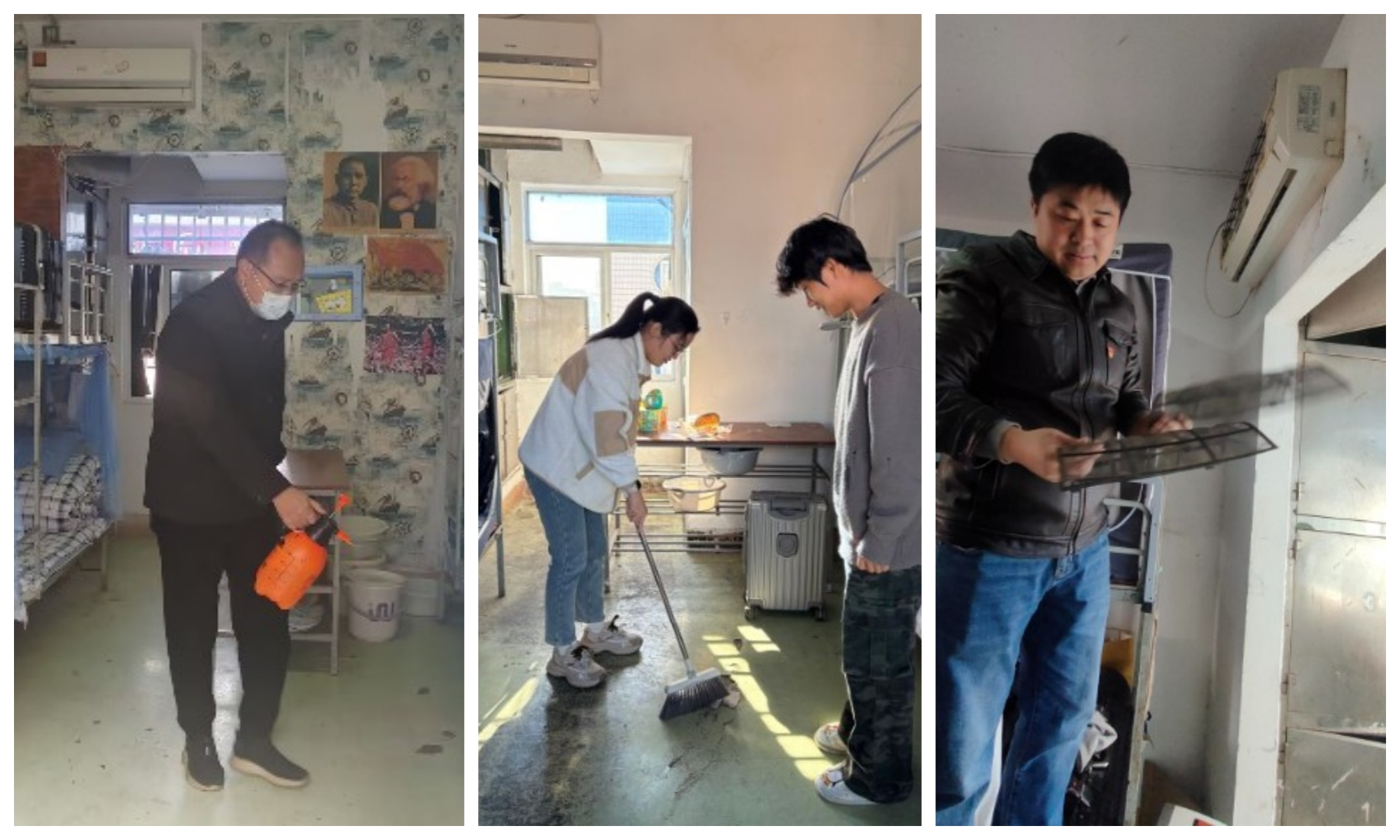 深入学生宿舍,办实事解难题。 学生宿舍是学生在校日常生活的重要场所,环境卫生与安全问题直接关系到学生的身心健康。数模教研室党支部党员教师利用课余时间,分组分批深入学生宿舍,开展暖心服务。他们手持工具,细心为学生清洗空调滤网,擦拭门窗玻璃,协助学生整理内务,改善住宿环境。特别是在近期流感高发时段,党员教师们还主动携带消毒用品,对学生宿舍公共区域及重点部位进行义务消毒消杀,向学生宣传普及疾病预防知识,用实际行动筑牢校园健康防线,传递关怀温暖。