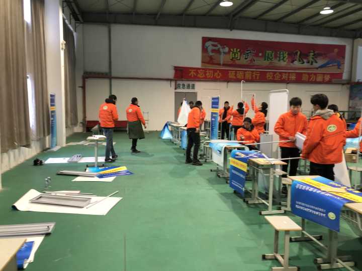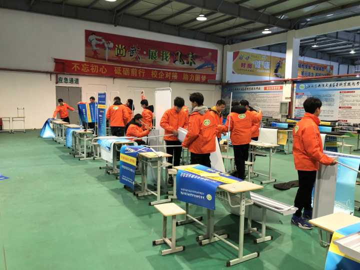 从7号开始,志愿者们就已经投入到双选会的准备工作中,布置会场、搭放展架、摆放展位桌椅等,在老师的带领下为双选会的隆重举行下足了功夫。