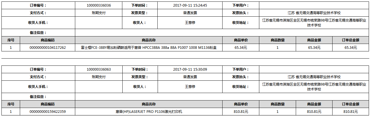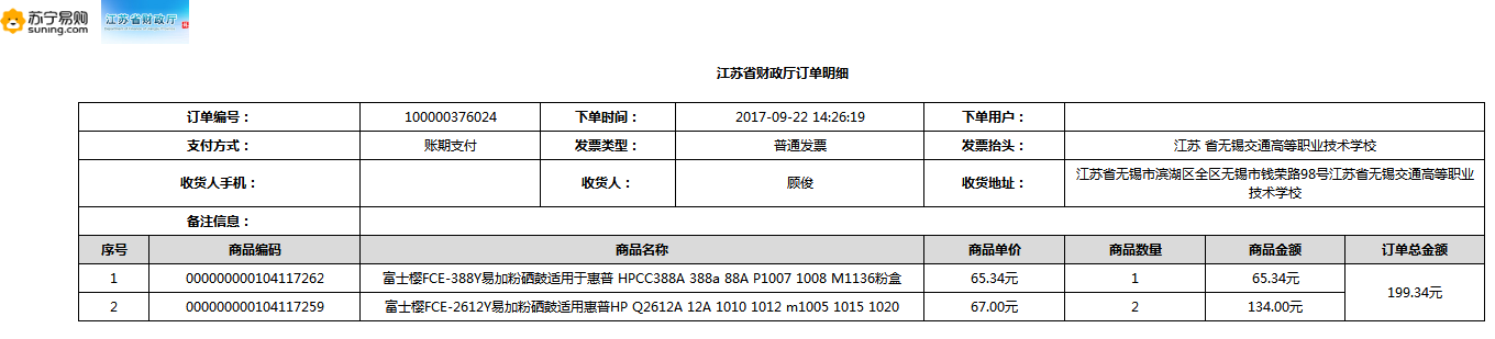 根据江苏省财政厅政府采购《关于在省级预算单位实行网上商城采购的通知》苏财购(2015)45号、《江苏省省级政府采购网上商城管理暂行办法》苏财购〔2015〕48号、《关于网上商城采购有关事项的补充通知 》苏财购〔2016〕18号、《关于推广江苏省省级政府采购网上商城采购有关工作的通知 》苏财办〔2016〕42号相关文件精神,建立江苏省省级政府采购网上商城专属采购平台。结合《关于省级“网上商城”支付方式的政策说明》及我校实际。依据《转发财政部关于进一步做好政府采购信息公开工作有关事项的通知》苏财购[2017]50号现就2017年9月14日-2017年11月27日网上商城采购订单明细进行公示: