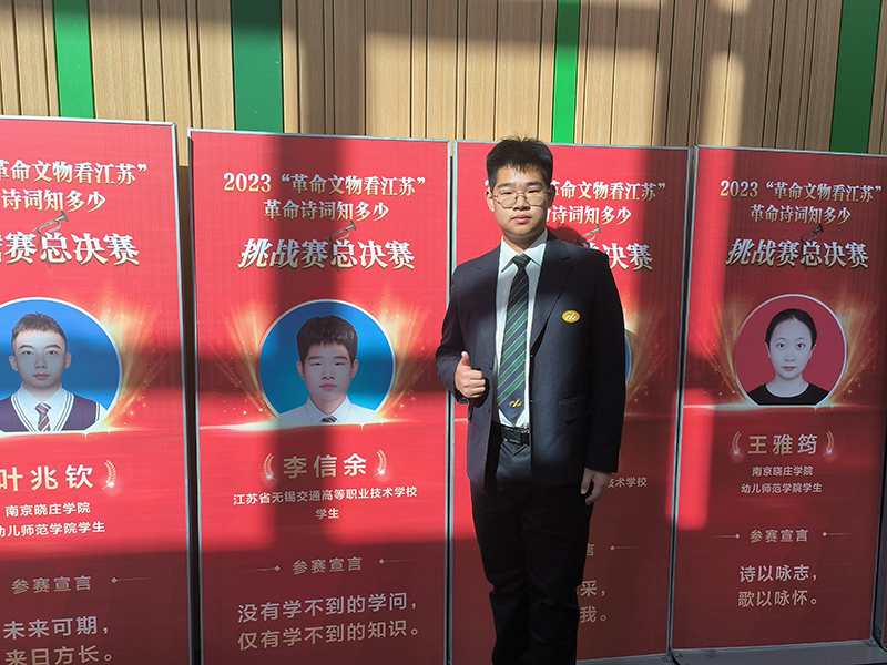 赓续历史文脉,谱写当代华章。1121日,2023“革命文物看江苏革命诗词知多少挑战赛总决赛在南京机电职业技术学院青春剧场举办。活动由江苏省文物局、共青团江苏省委、新华报业传媒集团主办,新江苏客户端·中国江苏网、学习强国江苏学习平台、南京机电职业技术学院承办。机电工程学院李信余在本次活动中荣获一等奖。