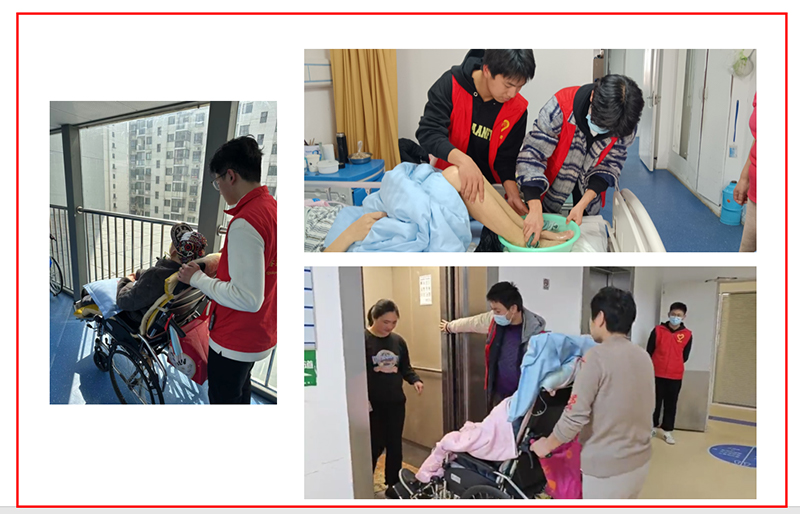 一部分同学前往病房帮患者推车、洗脚,聊天或协助家属推病患进出电梯,给予他们温暖和关怀;另一部分同学则在帮忙打扫环境卫生,让医护人员和患者拥有一个明亮干净的环境。