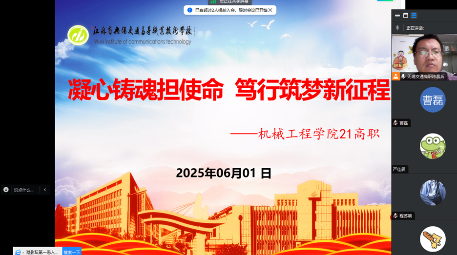 2025年6月1日晚,在毕业季的浓浓氛围中,机械工程学院2025届毕业生相聚云端,成功举行了一场主题为“凝心铸魂担使命 笃行筑梦新征程”的线上毕业班会。本次班会旨在为即将告别校园、踏上人生新旅程的毕业生们提供一个线上交流平台,总结在校学习时光,共叙师生情谊,畅谈未来规划,并送上母校最真挚的祝福。