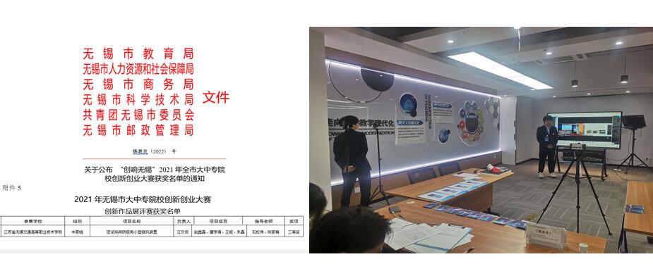汽车工程学院201511班汪文俊、唐学靖和王旭三名同学在石松伟、张家梅老师带领指导下,2022年4月18日-22日,参加了由无锡市教育局、人社局、商务局、科技局、共青团无锡市委员会、邮政局联合线上举办的"创响无锡"2021年无锡市大中专院校创新创业大赛。