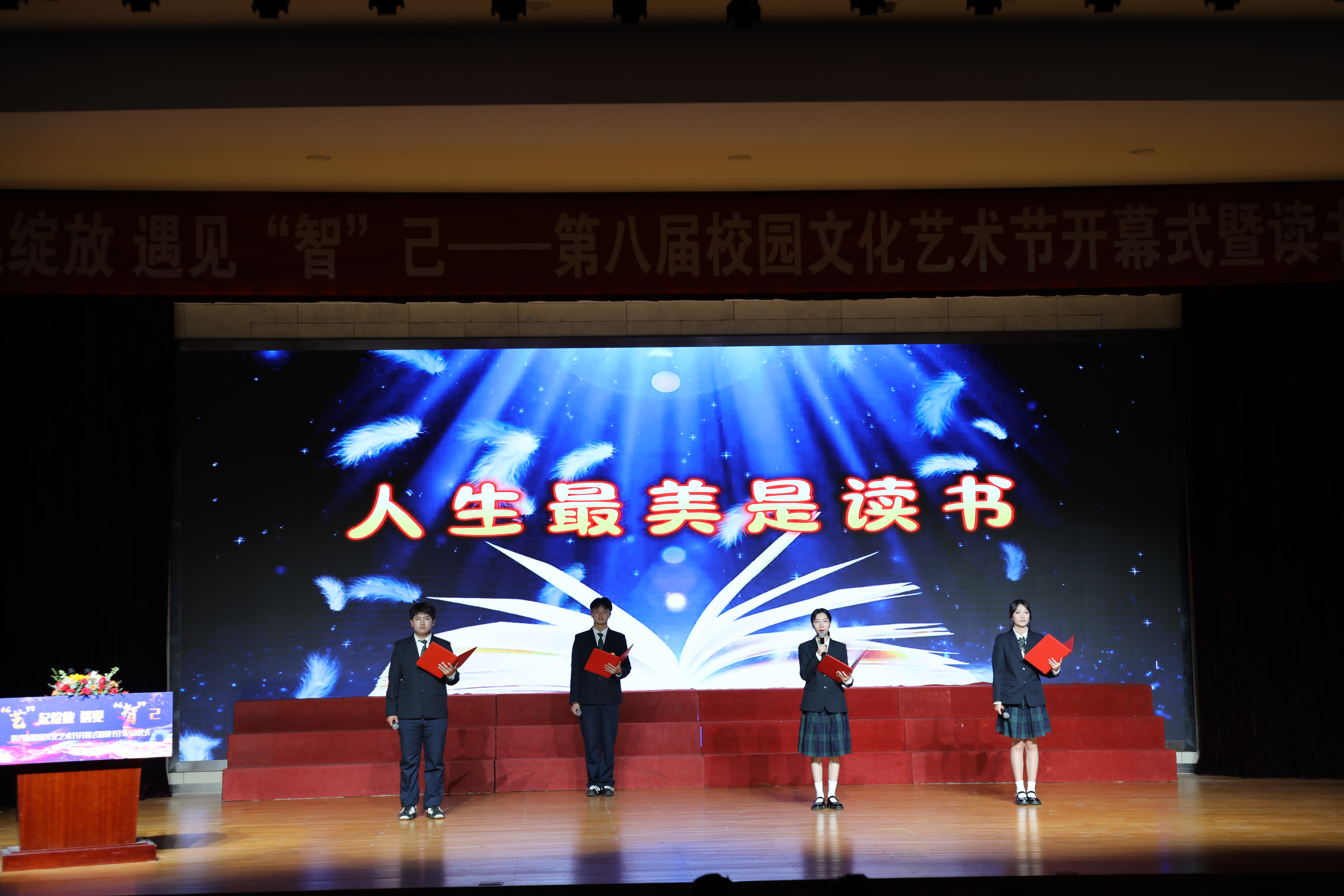 最美人间四月天,书香满园艺飞扬。4月23日,学校第八届校园文化艺术节开幕式暨读书节启动仪式在励志楼大礼堂隆重举行。图书馆作为学校文化传承与知识传播的重要阵地,深度参与了此次活动的筹备与组织工作,与团委学工等部门携手共进,为全校师生呈现了一场文化艺术与阅读书香交相辉映的盛宴。校领导、各处室院部负责人、教师代表及学生代表齐聚一堂,共享文化盛典。活动由学校副校长吴雪琴主持。