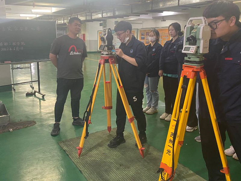 本次比赛共有来自船舶工程学院181141班20名同学参加。比赛要求学生利用激光电子经纬仪(LT 402L)及其三角支架、标尺、卷尺、水平尺和扳手等工量具根据轴系布置图和赛场给定的标记点,确定尾基点的位置,再操作使用激光经纬仪建立轴系理论中心线,调整尾轴管位置,最终使尾轴管中心与轴系理论中心线同轴。