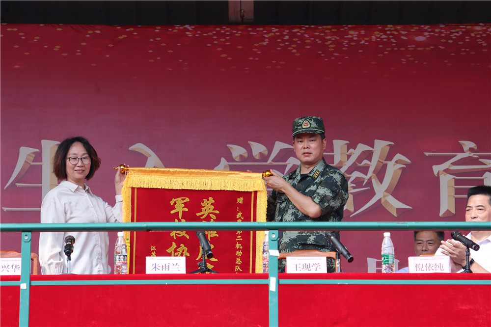 党委副书记朱雨兰对承训部队的大力支持表示感谢,向承训部队赠送了印有“英雄皮旅展英魂 军校协同育栋梁”的锦旗。她充分肯定了2021级新生的入学教育成果,并指出,同学们展示出了严明的纪律性和良好的团队意识,亮出了入学以来的第一张漂亮的成绩单,完成了大学第一课。对于同学们如何走好青春第一步,扣好步入无锡交校的第一粒扣子,朱书记提出了四点希望,一是怀揣梦想,志存高远。二是修身立德,勤于自省。三是精技强能,提高本领。四是强身健体,打牢基础。她还希望同学们能够发扬老黄牛精神,“勤”字当头,“不待扬鞭自奋蹄”,砥砺筑梦,铭记责任,把青春写在学校、写在无锡、写在祖国的大地上。
