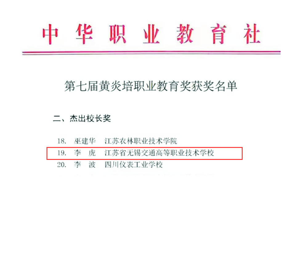 近日,中华职业教育社公布了第七届黄炎培职业教育奖获奖名单。学校党委书记、校长李虎荣获黄炎培职业教育杰出校长奖。