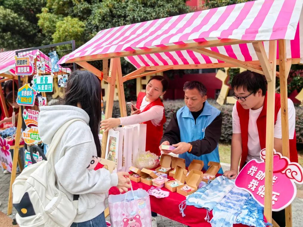 活动现场化身“创意工坊”,由残疾朋友精心创作的非遗文创作品与手工好物琳琅满目。扎染展区尤为亮眼,色彩斑斓的围巾、发卡、钥匙扣、头绳等作品,以传统扎染技艺为基底,融入创作者对生活的热爱,将普通布料幻化为灵动艺术;手工香皂、串珠饰品、绿植盆栽、非遗漆扇等展品整齐陈列,西漳社区残协带来的酸梅汤与冰粉摊位前更是人头攒动,师生们驻足品尝、踊跃选购,现场洋溢着欢声笑语。