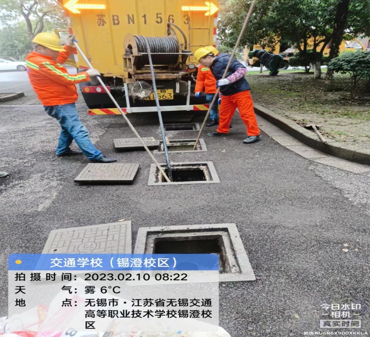 2023年2月10日,锡澄校区管理办公室联系学校雨污分流维保单位,在春季开学前对校园所有雨水井及管道、污水井及管道进行了全面疏通清理。