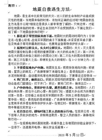 演练结束后,褚晓林主任对此次演练作了总结,他强调:开展应急疏散演练,旨在提高广大师生在危急时刻的自救自护能力,我们要通过一次次演练真正掌握在危险中迅速逃生、自救、互救的基本方法,希望全体教师、学生重视每一次演练,切实提升紧急疏散和应对突发事件的能力,同时也指出了本次演练过程中的不足,还发送了《地震自救逃生方法》的宣传资料。
