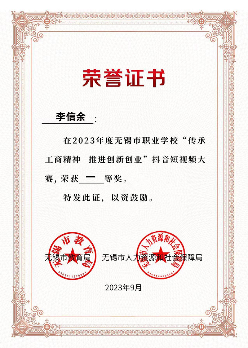 在2023年度无锡市职业学校“传承工商精神 推进创新创业”抖音短视频大赛中,机电工程学院221341班李信余同学拍摄并制作的《传承与弘扬无锡工商业精神》短视频荣获一等奖!