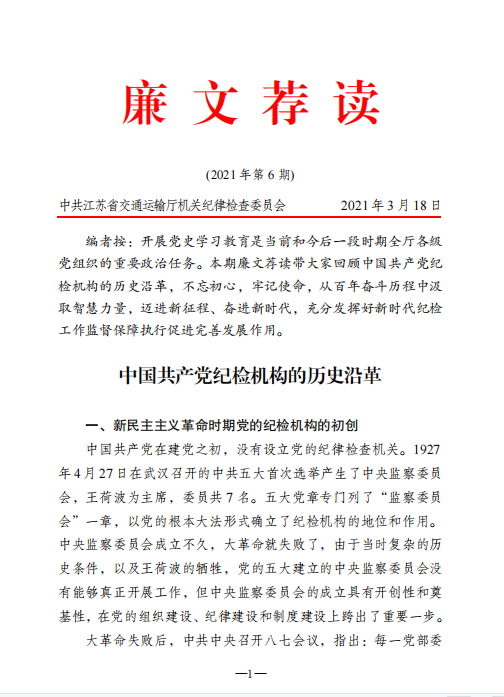 廉文荐读2021年第6期——中国共产党纪检机构的历史沿革
