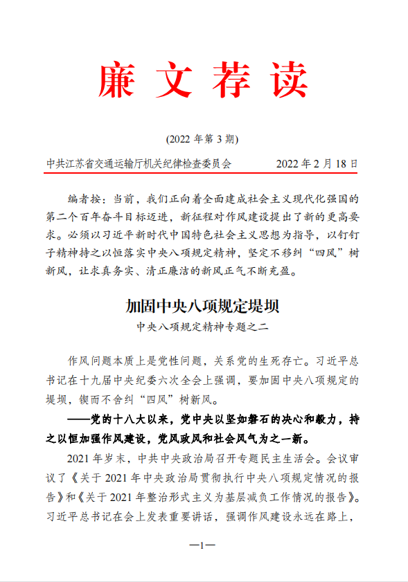 2022年廉文荐读第3期——加固中央八项规定堤坝