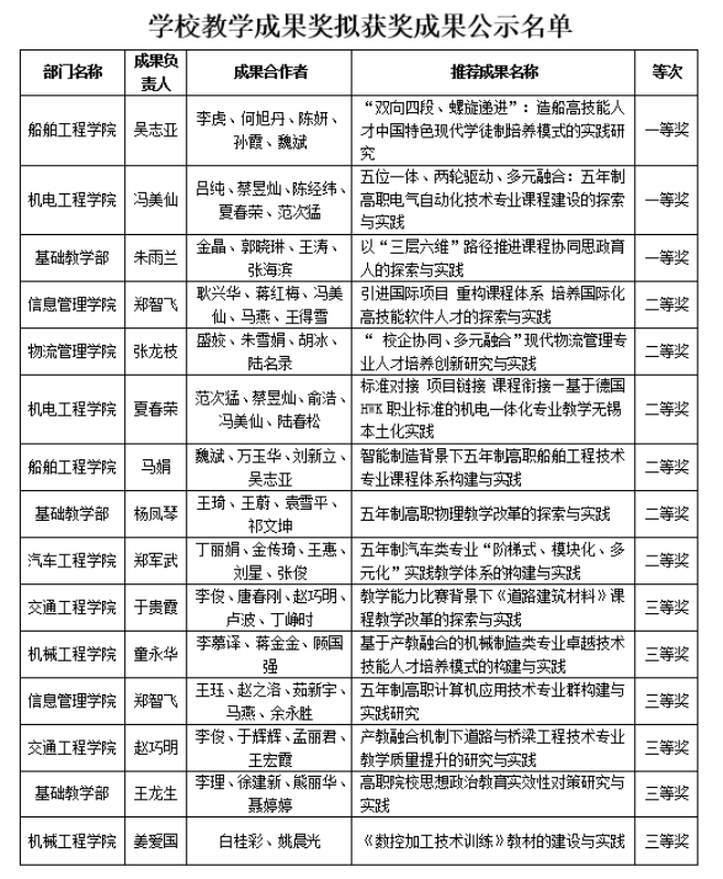 根据学校《关于开展2023年教学成果奖评选工作的通知》,学校启动了2023年教学成果奖的申报工作,共收到各部门的申报材料15份。经教学工作委员会专家评审,校务会审议,《“双向四段、螺旋递进”:造船高技能人才中国特色现代学徒制培养模式的实践研究》等3项为校级一等奖,《引进国际项目,重构课程体系——培养国际化高技能软件人才的探索与实践》等6项为校级二等奖,《教学能力比赛背景下《道路建筑材料》课程教学改革的探索与实践》等6项为校级三等奖,现予以公示。