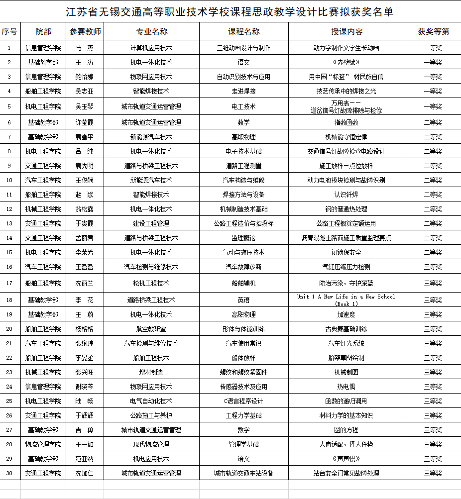 为全面贯彻落实高校思想政治工作会议和全国教育大会精神、教育部《高等学校课程思政建设指导纲要》(教高〔20203号)文件精神,落实立德树人根本任务,全面推进课程思政建设,充分发挥课堂主渠道在学校思想政治工作中的作用,总结凝练学校在课程思政教学方面的典型经验,推进和带动课程思政改革。根据学校《关于开展学校2024年课程思政教学设计比赛的通知》,学校组织开展了课程思政教学设计征集和评选活动,经自主申报、院部推荐、教务处审核和专家评审,评选出30件获奖作品,其中一等奖5项、二等奖10项、三等奖15项。现将结果进行公示,名单见附件,公示期为:2024623日至627日,如有异议请与教务处联系,联系电话:68781132