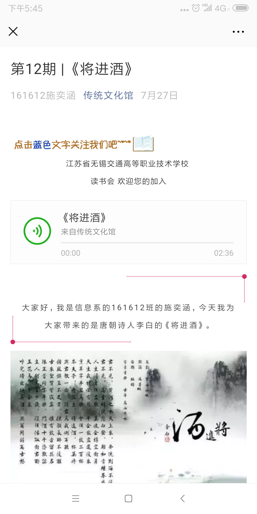 今年年初,在校领导的大力支持和关心下,大学生活动中心正式挂牌成立了。由此,金晶、徐福义两位老师共同指导学生组建的校级社团“读书会”有了固定的活动场所。“读书会”社团成立初衷就是希望通过阅读来丰富学生知识,拓宽视野,升华思想,从而提升综学生合素质。通过开展阅读活动,引导学生在日常生活、工作中提升自我学习的能力;在思维运转中成长,在彼此交流中交流精进。社团成员建立了微信群,供同学们课后交流。社团制定每学期活动计划,每周一中午组织社团活动,分享阅读书目,精彩片段,传统文化知识竞猜等。同时,社团在我校首次开创学生社团微信公众号“传统文化馆”。该平台主要发布学生阅读、朗诵文章以及原创文章等。同学们将自己喜爱的诗文,通过喜马拉雅APP朗诵录音并配乐,设计、排版到公众号平台。指导老师在后台审核,每天晚上8点整准时发布。通过网络方式,利用同学们碎片化时间,积极引导,提升同学们阅读兴趣。目前关注公众号人数已经高达1100人,在全校范围引起广泛关注,引领学生阅读热潮。