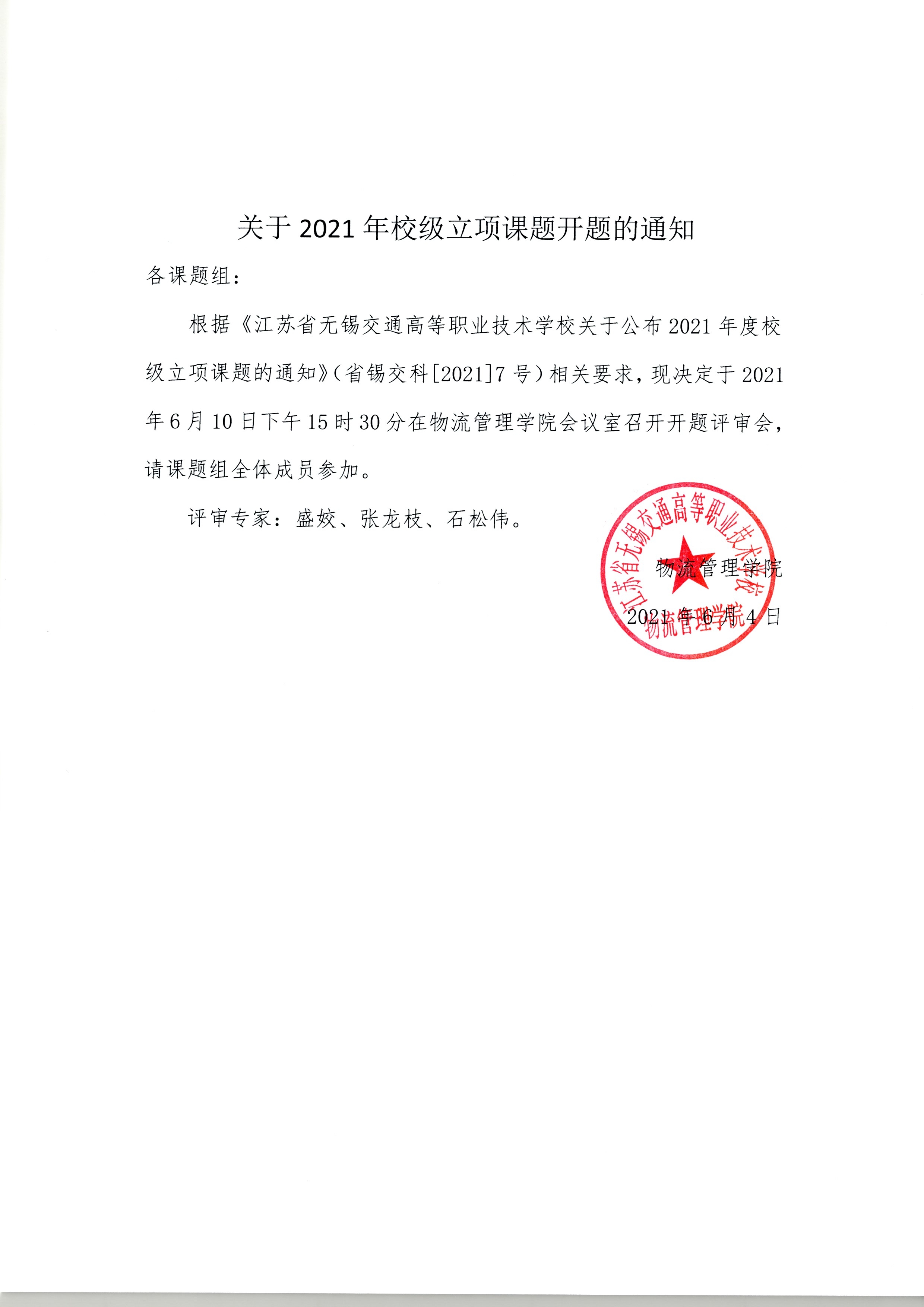 根据《开云app官方在线入口关于公布2021年度校级立项课题的通知》(省锡交科[2021]7号)相关要求,现决定于2021年6月10日下午15时30分在物流管理学院会议室召开开题评审会,请课题组全体成员参加。