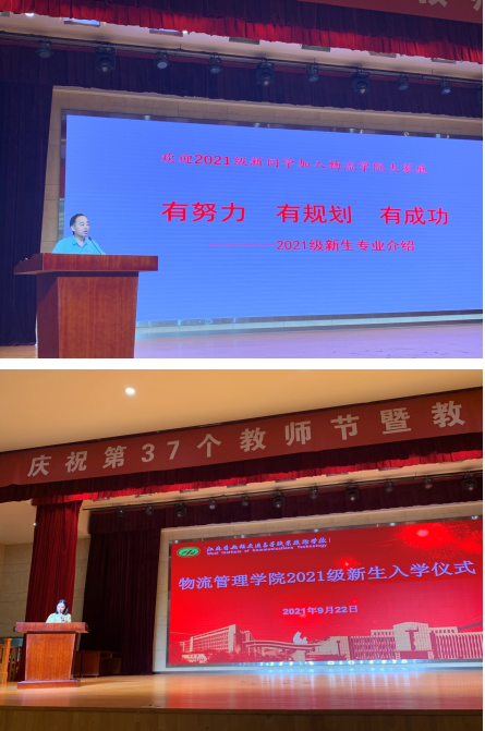 2021年9月22日上午物流管理学院在学校大礼堂开展了2021级新生入学仪式。学院副院长江玉婷老师主持仪式,学院副院长盛姣老师、党总支副书记张龙枝老师、各内设机构负责老师,2021级全体新生、新生班主任和教官参加仪式。