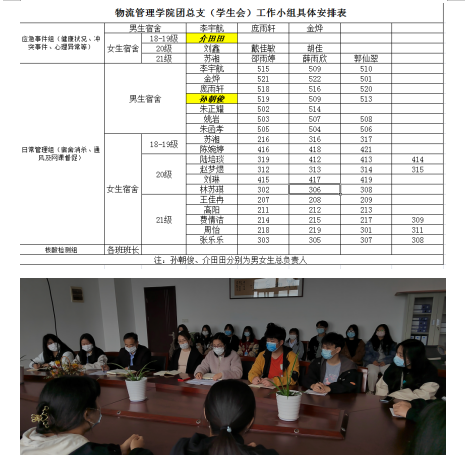 会后,学院制定物流管理学院团总支(学生会)工作小组具体安排表,希望各位同学停课不停学,做好个人防控,助力学校、助力无锡市打赢疫情防控阻击战!
