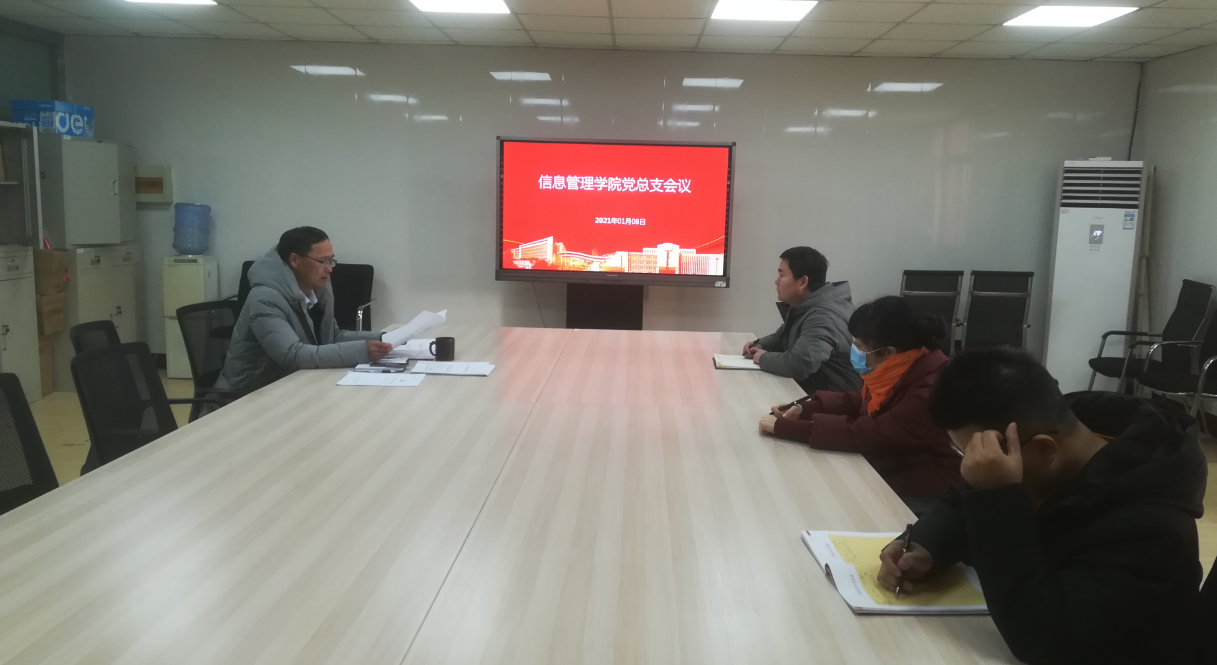 2021年1月8日下午三点,信息管理学院党总支在学院三楼会议室召开总支委员会议,传达学校有关消防安全、党风廉政建设、师德师风建设等有关文件精神及研究部署期末工作。学院党总支委员参会,会议由院长郑智飞主持。