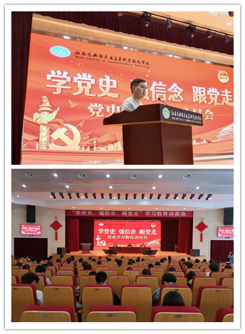为深入学习贯彻落实习近平总书记关于学习党史的重要讲话和指示精神。学校于2021年4月8日15:15,在励志楼四楼大礼堂,开展“学党史、强信念、跟党走”学习教育动员会。学院团总支书记朱沛作为二级学院团组织代表在大会上发言。