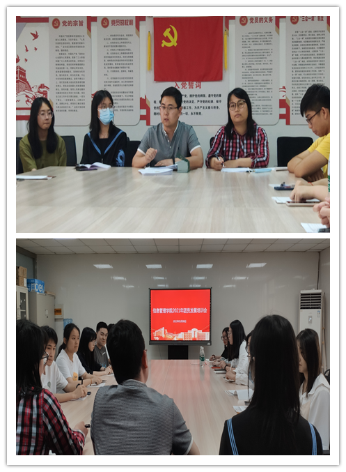 为加强团员队伍先进性建设,切实规范信息管理学院团员发展管理工作,5月8日下午三点,信息管理学院2021年团员发展工作专题培训会议在学院会议室召开。团总支书记朱沛老师、团总支组织委员王得雪老师、团总支副书记徐颖同学及部分团支书代表、新团员代表参加会议,会议由朱沛老师主持。