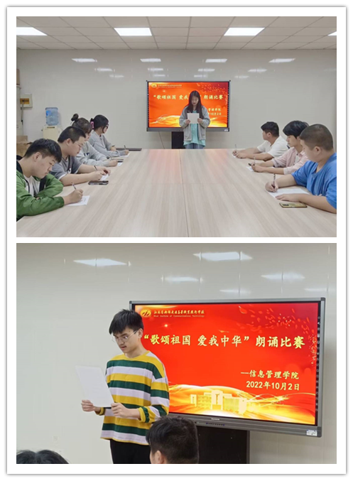 “金秋十月好心境,举国欢腾迎国庆”。为进一步庆祝国庆的到来,弘扬中华传统文化,激发同学们的爱国情怀,提升同学们对诗歌美文的兴趣。2022年10月2日,信息管理学院在正德楼三楼会议室举办了“歌颂祖国,爱我中华”主题朗诵比赛。
