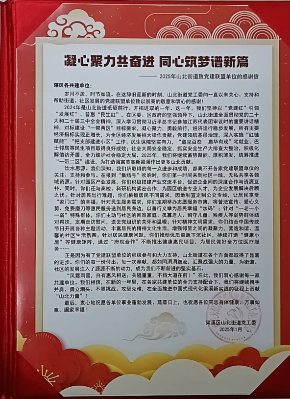 2024年6月,信息管理学院党总支与惠麓社区签订了党建共建协议。协议签署后的一系列关爱慰问困难老人的志愿活动,赢得社区居民广泛好评。近日,山北街道为此特向信息管理学院党总支发来感谢信,对学院志愿者的辛勤付出与暖心关怀表示衷心感谢。