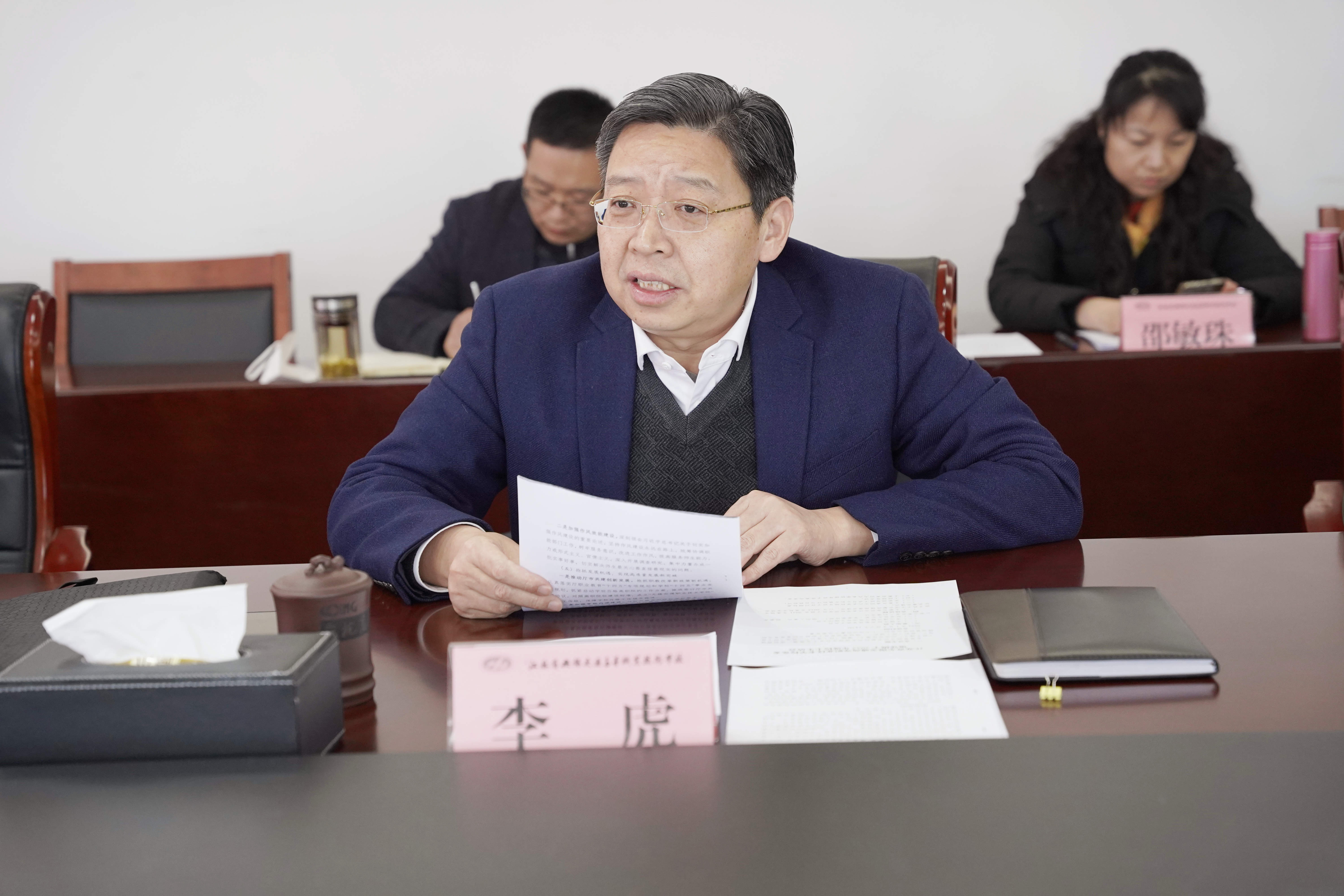 最后,李虎书记代表党委领导班子作表态发言,一要提高政治站位,坚定维护党中央集中统一领导。自觉在思想和行动上同以习近平同志为核心的党中央保持高度一致,坚决做“两个确立”的坚定信仰者和忠实践行者,不折不扣把各项决策部署落到实处。二要带头发扬斗争精神,积极主动作为。学校正处于推进高质量发展的重要阶段,作为领导班子要增强斗争精神,积极担当作为,以饱满的精神状态谋划学校升格发展工作,主动思考破解学校发展瓶颈问题,带领教职工实现学校高质量发展目标。三要坚持自我革命,压实全面从严治党责任,推动管党治党同向发力、形成合力,推动学校各项事业不断迈向新台阶。